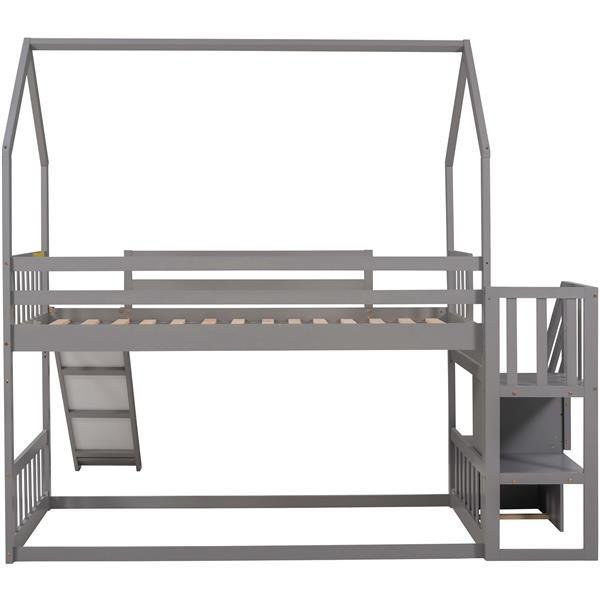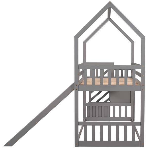 House Bunk Bed with Convertible Slide,Storage Staircase can be Placed Left or Right,Gray