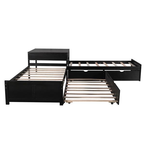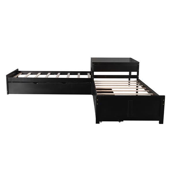 L-shaped Platform Bed with Trundle and Drawers Linked with built-in Desk,Twin,Espresso