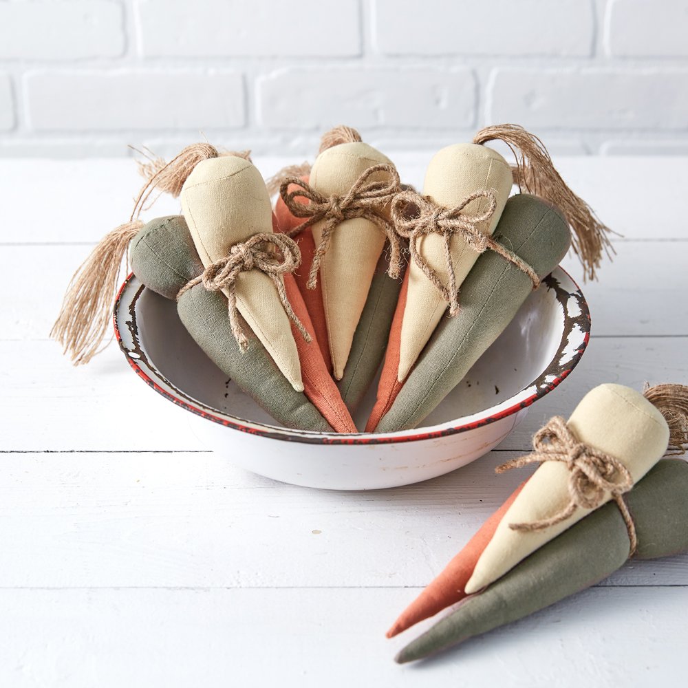 These fabric carrots are all the fun without the mess. Perfect for Easter and spring decor, these carrots will look perfect in a tiered tray or basket. Carrots come tied together with jute. Medium carrot measures 2'' dia. x 8''H and smallest carrot measures 2'' dia. x 6''H.