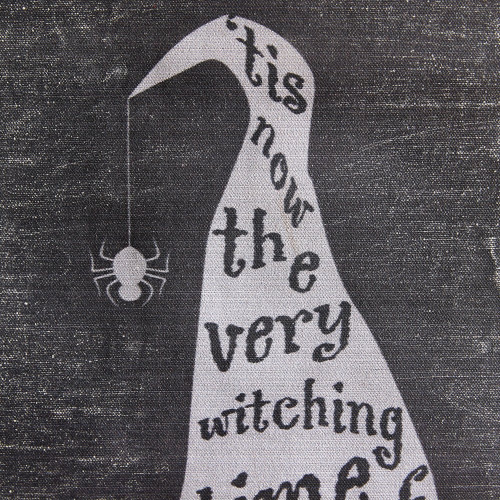Tis' now the very witching time of the night! This hanging wall canvas embraces all things Halloween and will complete your spooky collection. It features a jute rope for hanging and wooden borders on each end.