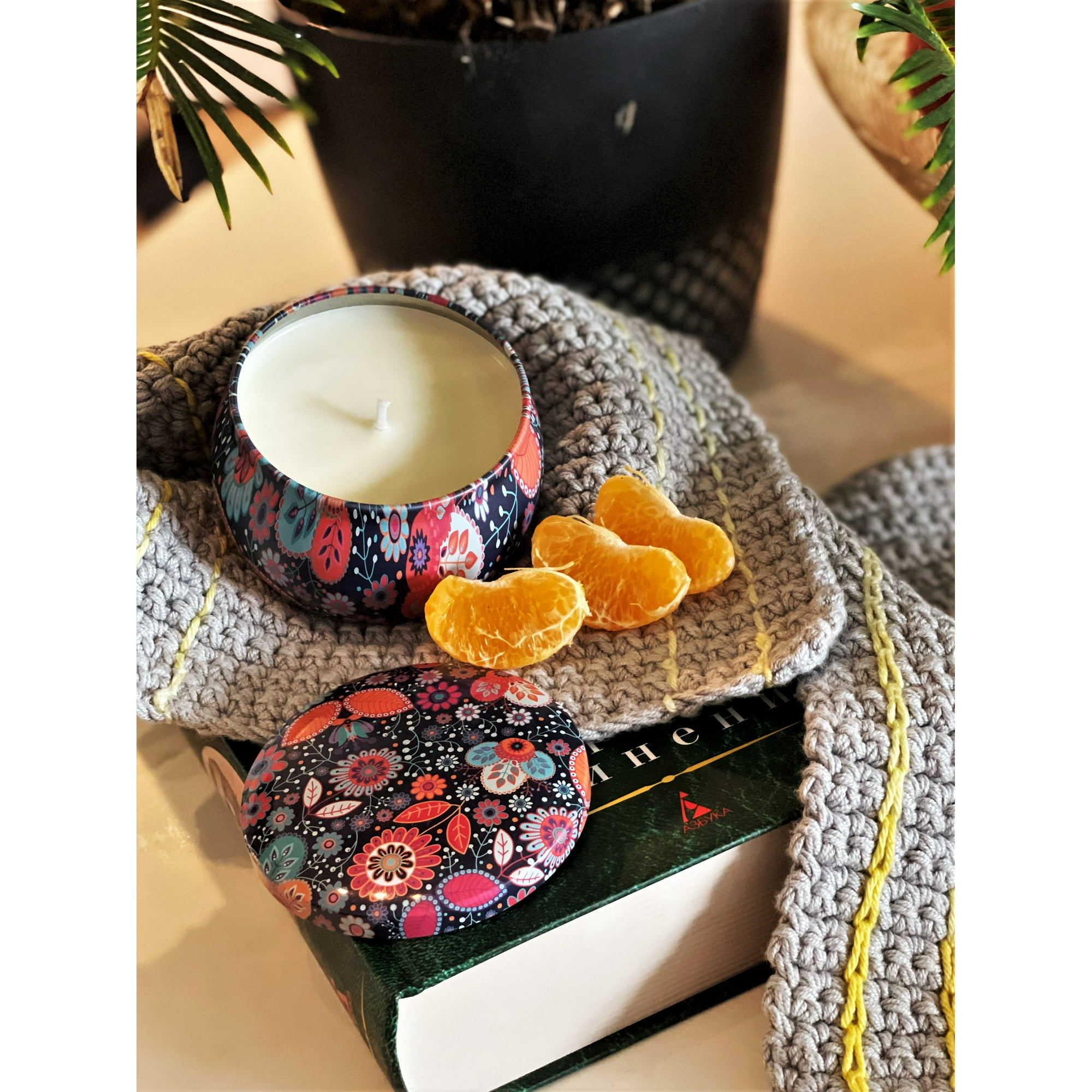 Amazing colorful tin - our candles come in an amazing decorative metal tin! The tin is colorful and perfect for gift giving. It's also a great way to store your candle when you're not using it.