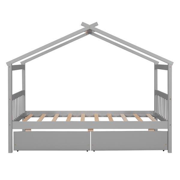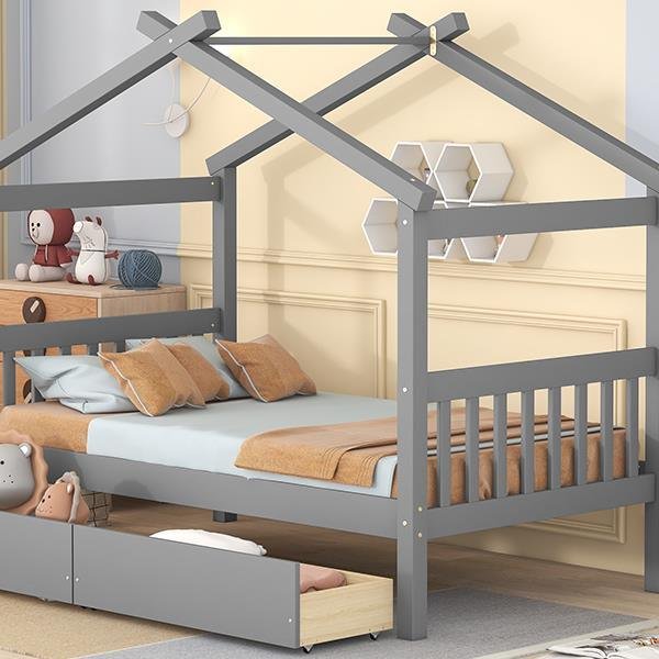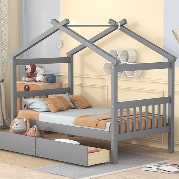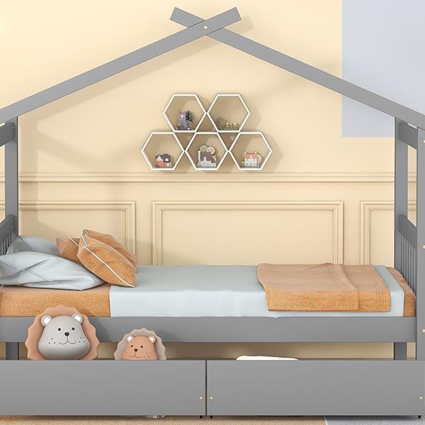 Home > Twin Size Wooden House Bed with Drawers, Gray